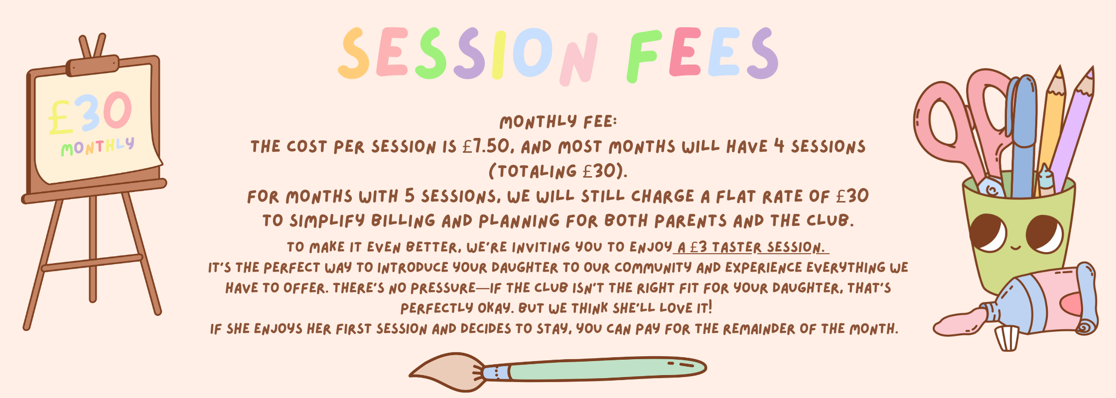 - Creative Crafts: Each week, we dive into exciting projects from painting and clay modeling to seasonal crafts like flower crowns and holiday decorations. Bracelet making, multi-media collages and lots more.